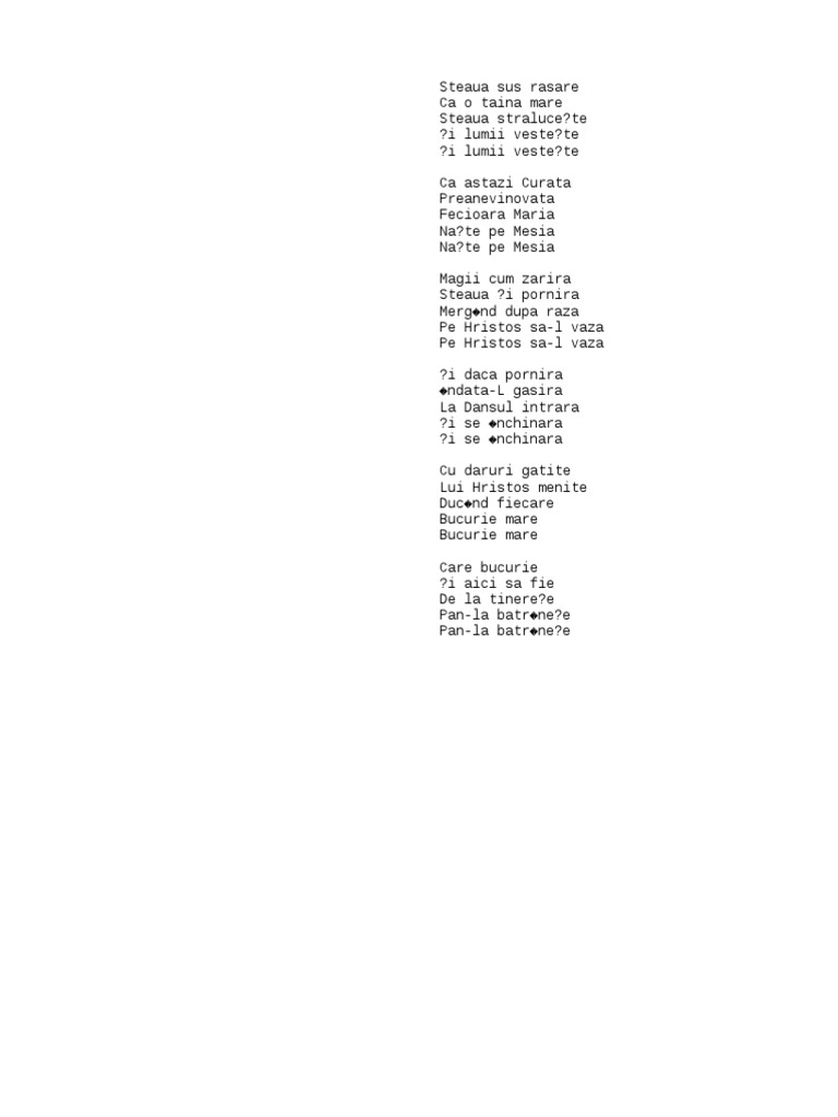 Steaua sus rasare ca o taina mare steaua straluceste si lumii vesteste, si lumii vesteste. Ca astazi curata, prea nevinovata, fecioara maria naste pe mesia naste pe mesia. Ana maria fusu bianca hall vasil chekardzhikov. Ca astazi curata, preanevinovata fecioara maria naste pe mesia, naste pe mesia. Изгряваща звезда като голяма мистерия звездата свети и светът обявява и светът обявява. Cine primeşte steaua frumoasă şi luminoasă, cu colţuri multe şi mărunte. Ca astazi curata, prea nevinovata, fecioara maria naste pe mesia naste pe mesia. De la naşterea lui hristos. Слушать steaua sus rasare онлайн. Скачивай и слушай millenium steaua sus rasare и cleopatra stratan steaua sus rasare на zvooq.online! Steaua sus răsare colinde de iarnă pentru copii tralala. Ca un soare luminos ? Steaua sus rasare petrica mitu stoian.